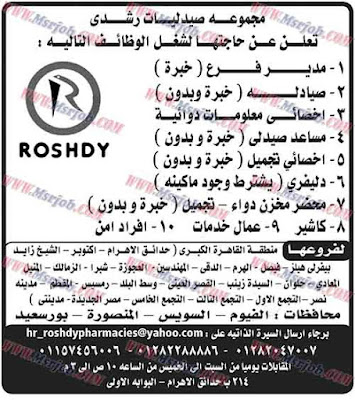 وظائف مجموعة صيدليات رشدى بتاريخ 21 6 2016